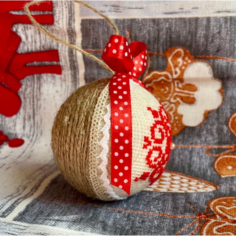 Kombinace přírodních materiálů – bavlny a juty – v propojení s atlasovou stuhou dodává ozdobě autentický rustikální charakter s nádechem vánoční elegance. Atlasová stuha krásně ladí s vyšívaným motivem a vytváří harmonický celek.
