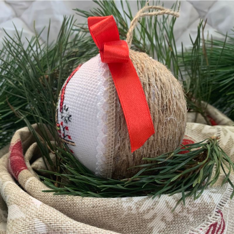 Polystyrenová kulička omotaná jutovým provazem, ozdobená krajkou, atlasovými stuhami a vyšitým křížkem obrázkem.