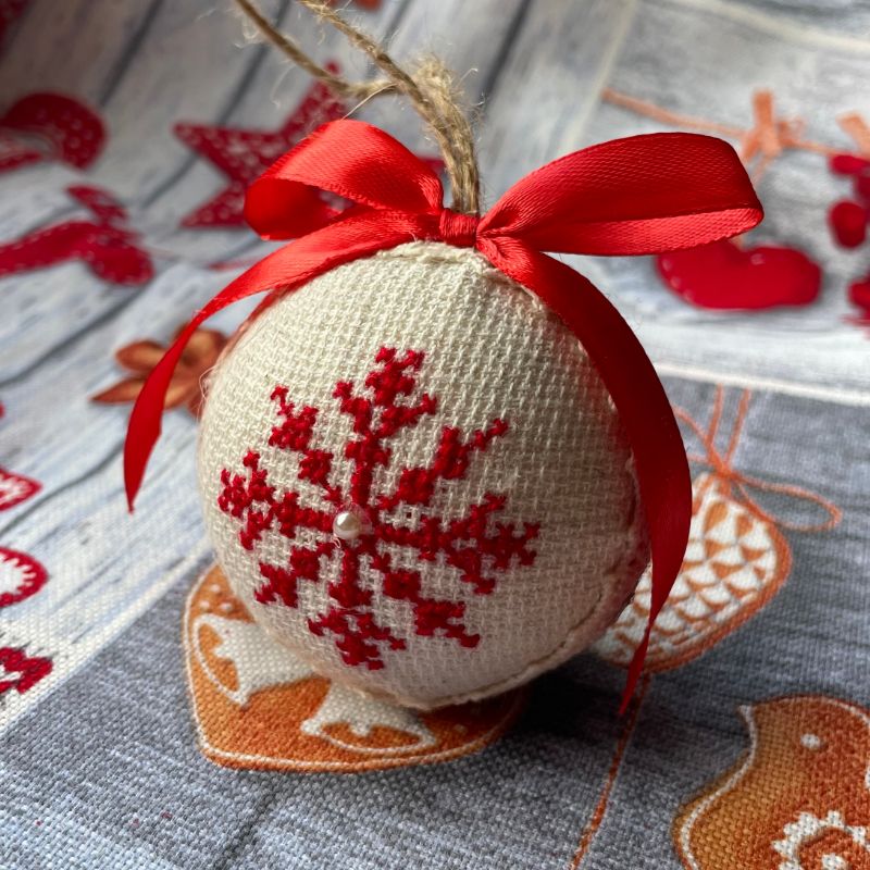 This delicate ornament brings the beauty of snowy winter into your home. The hand-embroidered snowflake creates a perfect contrast that immediately catches the eye. The elegant ribbon and natural jute cord give the ornament rustic charm with a touch of Christmas elegance.