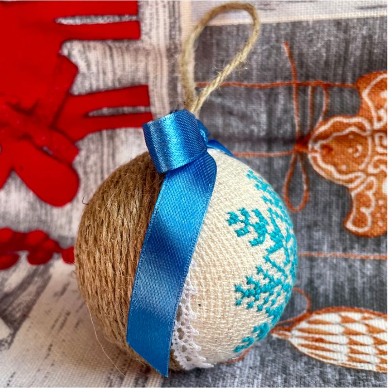 The combination of natural materials – cotton and jute – paired with satin ribbon gives the ornament an authentic rustic character with a touch of Christmas elegance. The satin ribbon beautifully complements the embroidered motif, creating a harmonious whole.