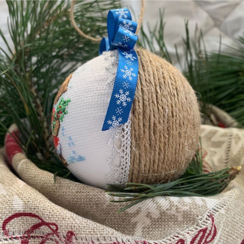 Embroidered on cotton fabric, decorated with jute and a dark blue satin bow. With a diameter of 80 mm, it stands out beautifully on a Christmas tree, wreath, or festive display.