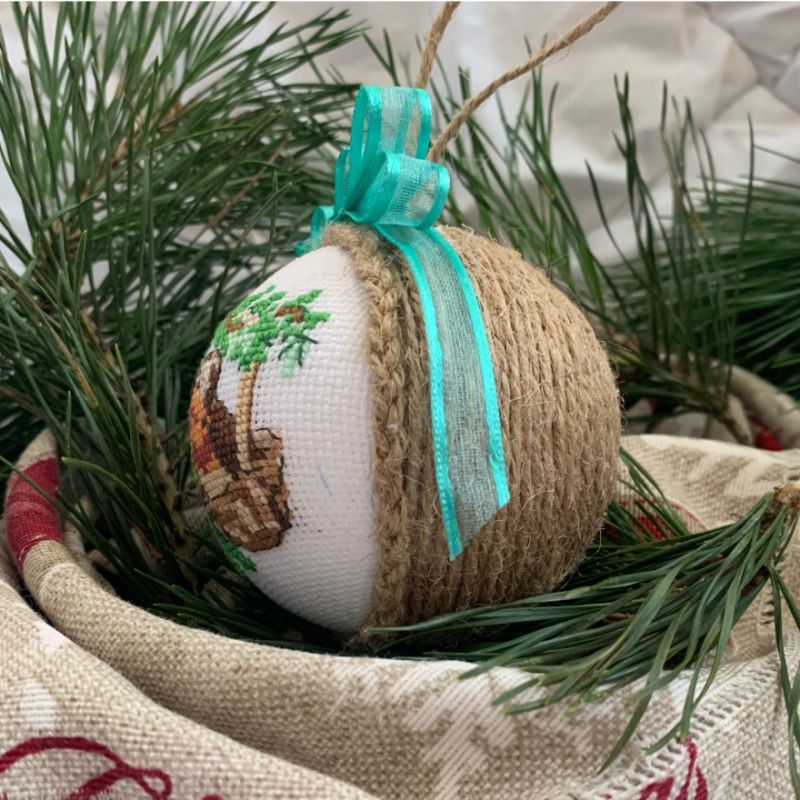 Polystyrene Christmas ball, one half covered with jute rope and decorated with lace and satin ribbons, the other half embroidered.