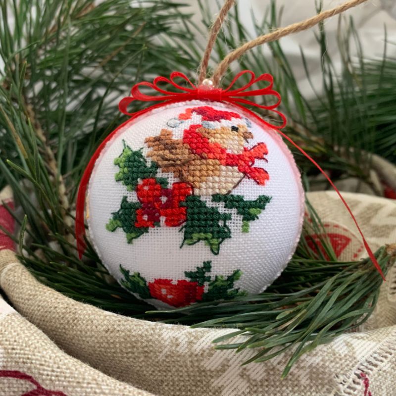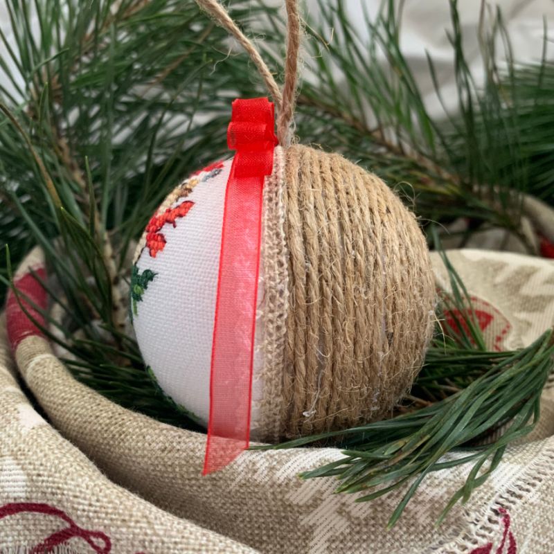 Polystyrene ball wrapped with jute rope and decorated with lace, satin ribbons and cross stitch embroidered picture with a bullfinch.